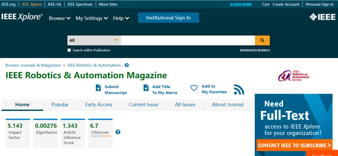 今天,我们来看看这本SCI期刊:IEEE ROBOTICS & AUTOMATION MAGAZINE。从现有的记录来看,IEEE ROBOTICS & AUTOMATION MAGAZINE 的2021年影响因子(JCR2020)是5.143,2020年是3.591,比2020年增长1.552,增长比例43.22%。