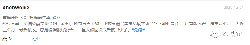 Clinical and Experimental Immunology每年出版12期;官网表明2020年从提交稿件到第一次决定平均为16天,从提交到最后编辑决定平均为33天;通过对近期已发表文章审稿速度的抽样统计,大部分文章的审稿周期都是在1-2个月左右便可接受,最快的1个多月就可以接受!慢的也有个别需要4个多月,总说审稿周期是整体偏快,相对稳定,官网给出的接受率为24%,相对较低。