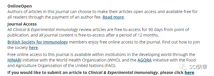 根据官网消息,在Clinical and Experimental Immunology是一本混合开放获取的期刊,如果选择OA的话每篇文章收取2250美元的文章处理费,折合人民币约为14199元;所有临床与实验免疫学评论文章从发表之日起90天内免费访问,所有期刊内容可在 12 个月后免费访问。