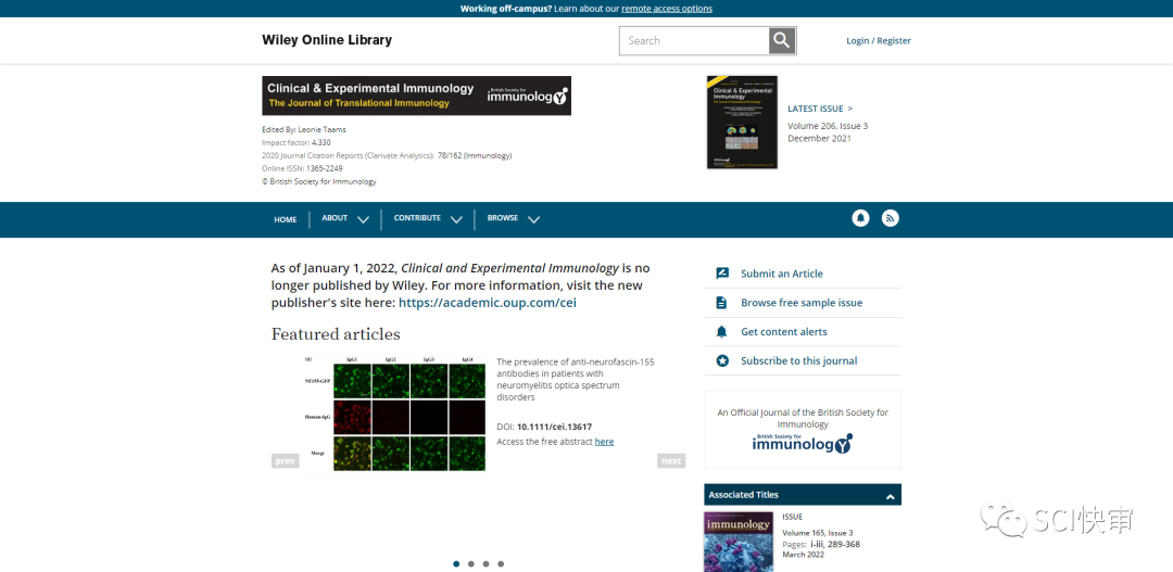 Clinical and Experimental Immunology,ISSN:0009-9104,E-ISSN:1365-2249,1966年创刊,出版国家:英国;由WILEY出版。近6年影响因子文中有进,2015年至2019年影响因子均为3分+,2020年影响因子为:4.33。即时因子为5.246,2021年影响因子或将有新突破,值得关注!