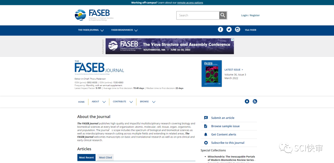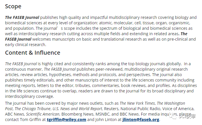 FASEB JOURNAL是本多学科研究期刊,涵盖生物和生物医学科学的每一个层次的组织,还包括生物和生物医学科学的光谱,以及基础和转化研究、临床前和早期临床研究的稿件。