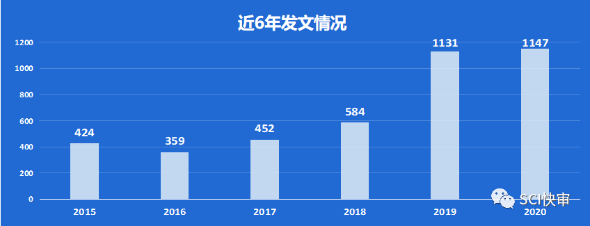 FASEB JOURNAL近6年发文量呈上升趋势,2015年至2018年发文量均在600篇内,2019年开始扩篇至1000多篇;近几年综述类年发文量均为30篇以内,较少;2020年国人发文占比为38.75%,国人发文占较多。