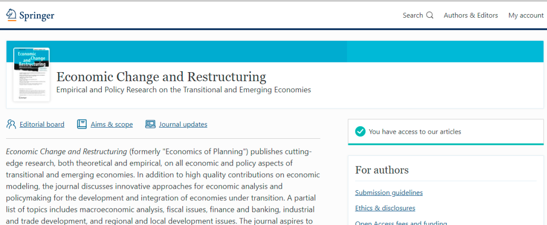 今天,我们来看看这本SCI期刊:Economic Change and Restructuring。从现有的记录来看,Economic Change and Restructuring 的2021年影响因子(JCR2020)是2.472,自引率40.45%。