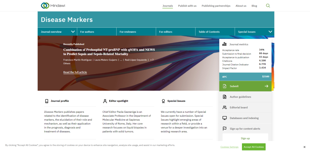 Disease Markers发表有关疾病标记的鉴定、作用和机制的阐明以及在疾病预后、诊断和治疗中的应用等。
