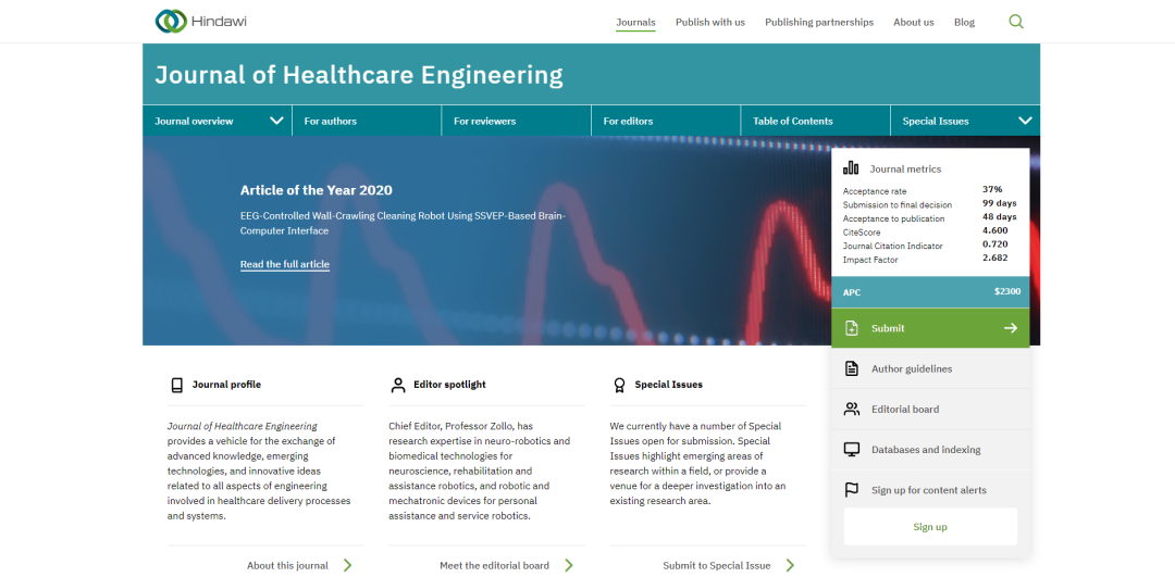 今天给大家推介的期刊是:Journal of Healthcare Engineering