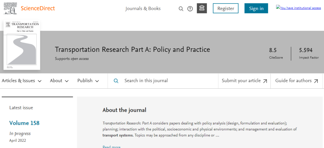 今天,我们来看看这本SCI期刊:TRANSPORTATION RESEARCH PART A-POLICY AND PRACTICE。从现有的记录来看,TRANSPORTATION RESEARCH PART A-POLICY AND PRACTICE 的2021年影响因子(JCR2020)是5.594,2020年是3.992,比2020年增长1.602,增长比例40.13%。