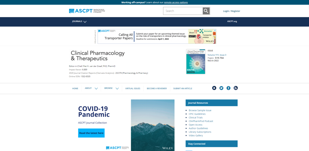 期刊官网:https://ascpt.onlinelibrary.wiley.com/journal/15326535