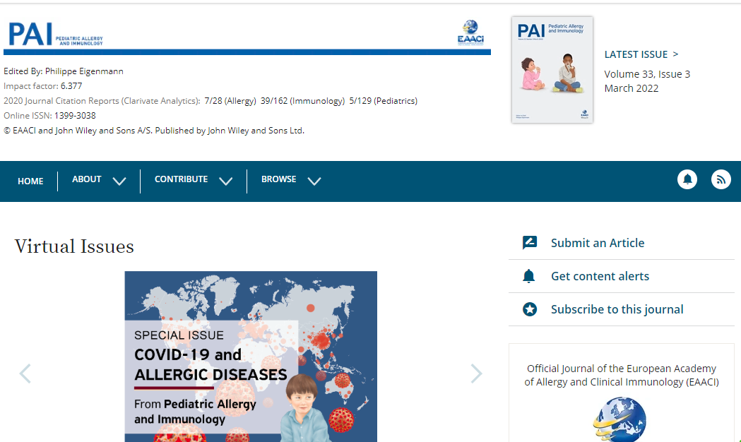 Pediatric Allergy and Immunologyis the world's leading journal in pediatric allergy, publishing original contributions and comprehensive reviews related to the understanding and treatment of immune deficiency and allergic inflammatory and infectious diseases in children.