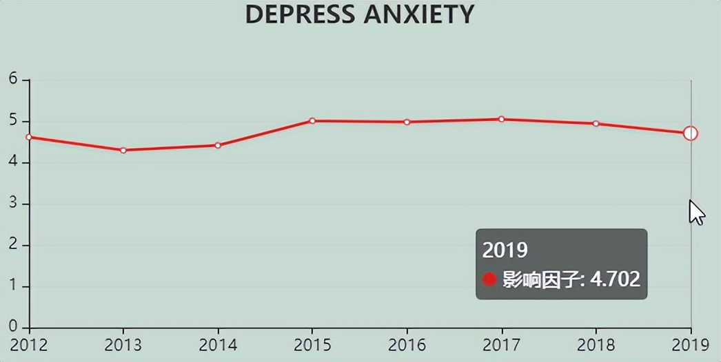 今天,我们来看看这本SCI期刊:DEPRESSION AND ANXIETY。从现有的记录来看,DEPRESSION AND ANXIETY 的2021年影响因子(JCR2020)是6.505,2020年是4.702,比2020年增长1.803,增长比例38.35%。