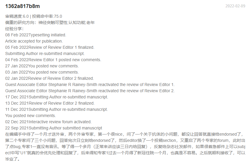 Frontiers in Aging Neuroscience官网表明2021年从提交稿件到从提交到最终决定的平均时间:90 天;通过对近期已发表文章审稿速度的抽样统计,大部分文章的审稿周期都是在1-4个月左右便可接受,最快的1个多月就可以接受!慢的也需要4个多月,审稿周期有快有慢。