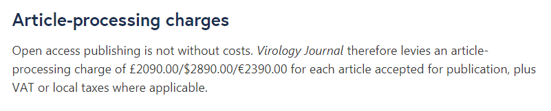 根据官网消息,在Virology Journal发表,作者支付文章出版费 (APC)为 2090.00 英镑/2890.00 美元/2390.00 欧元,折合人民币约为19417元,价格也不算太贵。