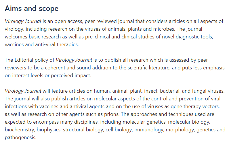 Virology Journal收录病毒学所有方面的文章,包括动物、植物和微生物的病毒研究,欢迎关于新型诊断工具、疫苗和抗病毒疗法的基础研究以及临床研究,还可发表关于用疫苗和抗病毒制剂控制和预防病毒感染的分子方面的文章,以及关于使用病毒作为基因治疗载体的文章,以及关于朊病毒等其他制剂的研究文章。涵盖许多学科,包括分子遗传学、分子生物学、生物化学、生物物理学、结构生物学、细胞生物学、免疫学、形态学、遗传学和发病机制。