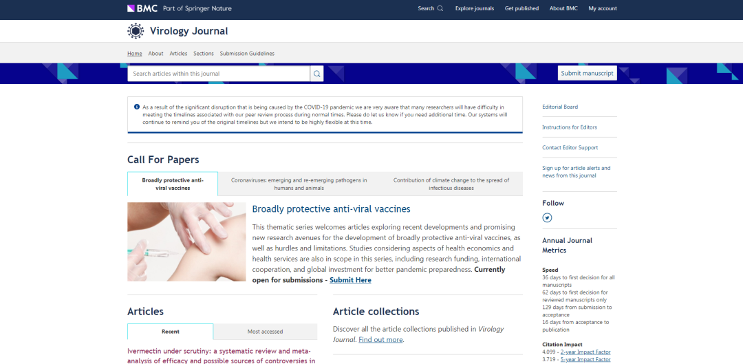 Virology Journal是病毒领域的期刊,涵盖多学科,JCR2区,中科院3区;近5年影响因子从2分涨至5分,今年或将有新突破;自引率较低,OA费用一般,发文量不多,国人相对友好,从最近上线的稿件来看审稿有快有慢,整体较快,前期的时间会相对较长,有合适的研究又不是特别急着用的,还是值得尝试投稿的的!