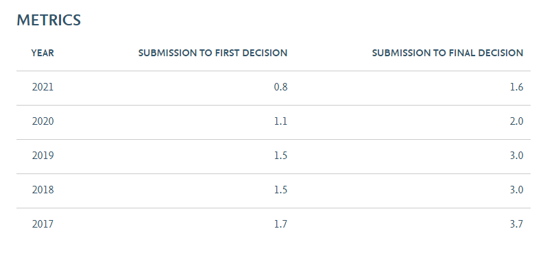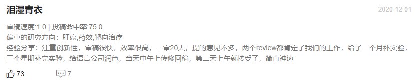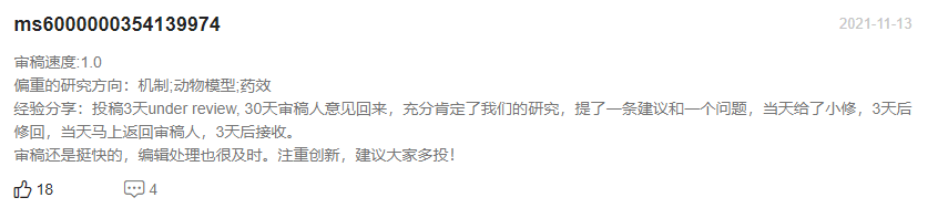 Pharmacological Research官网表明2021年从稿件提交到文章初步决定平均为0.8周,从稿件提交到最终编辑决定平均为1.6周;通过对近期已发表文章审稿速度的抽样统计,大部分文章的审稿周期都是在2个月左右便可接受,最快的有18天就可以接受!慢的也要3个多月,总的来说审稿周期整体比较快。