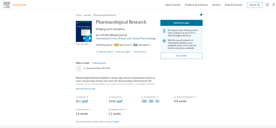 期刊官网:https://www.journals.elsevier.com/pharmacological-research