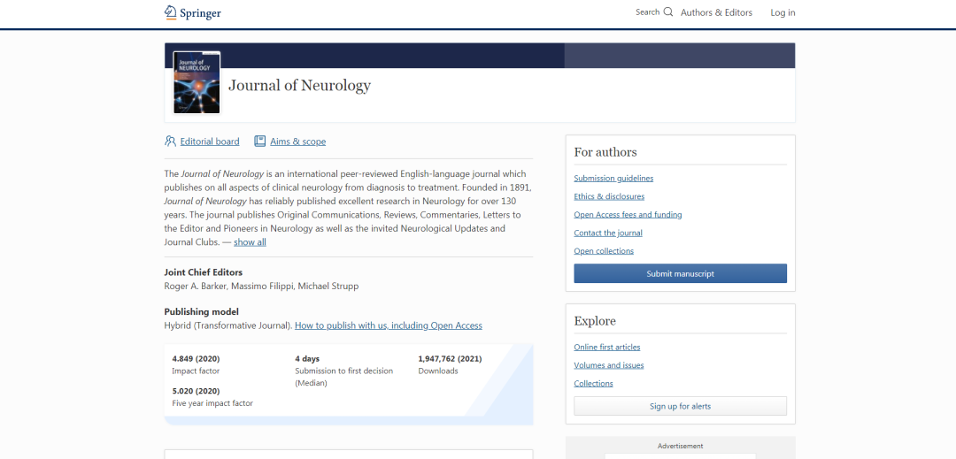 JOURNAL OF NEUROLOGY,ISSN:0340-5354;E-ISSN:1432-1459;1891年创刊;出版地区:英国;由Springer Berlin Heidelberg出版。近5年影响因子均在3-4分,2020年影响因子为4.849,即时因子为5.54,今年或将继续突破,值得关注。