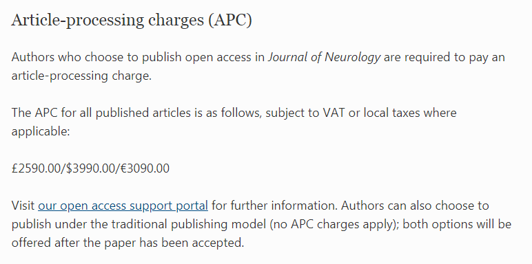 根据官网消息,在JOURNAL OF NEUROLOGY发表,作者支付文章出版费 (APC)为 2590.00 英镑/3990.00 美元/3090.00 欧元,折合人民币约为26763元,价格比较贵,如果选择在传统出版模式下出版(不收取APC费用)。