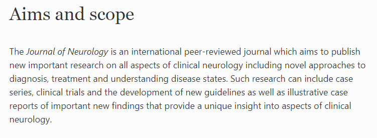 JOURNAL OF NEUROLOGY发表关于临床神经病学各个方面的有新意的重要研究,包括诊断、治疗和了解疾病状态的新方法,可以是病例系列、临床试验和新指南的制定,以及重要新发现的说明性病例报告。