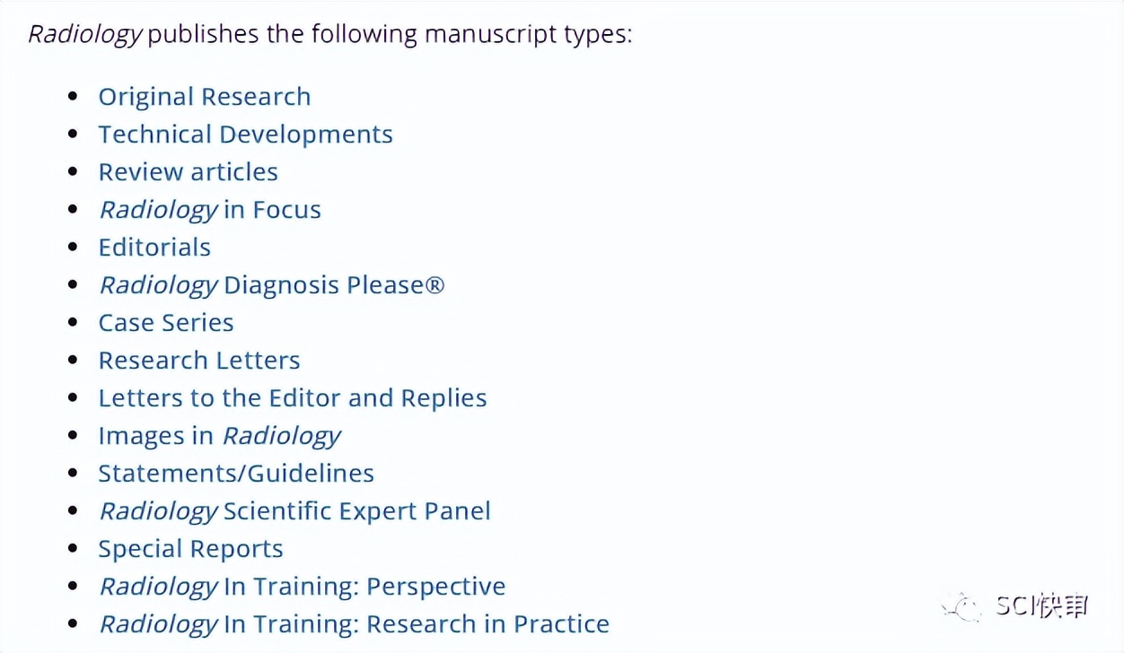 RADIOLOGY发表诊断放射学、核医学或放射肿瘤学相关的研究,涵盖以下手稿类型: