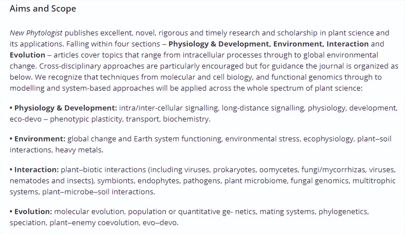 New Phytologist主要分为四个部分-生理与发育,环境,相互作用和进化-文章涵盖了从细胞内过程到全球环境变化的主题。