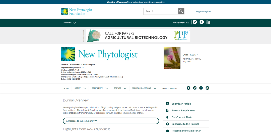 期刊官网:https://nph.onlinelibrary.wiley.com/journal/14698137