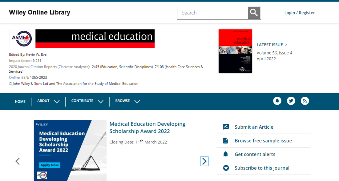 今天,我们来看看这本SCI期刊:MEDICAL EDUCATION。从现有的记录来看,MEDICAL EDUCATION 的2022年影响因子(JCR2021)是7.647,2021年影响因子6.251,2020年影响因子4.570。