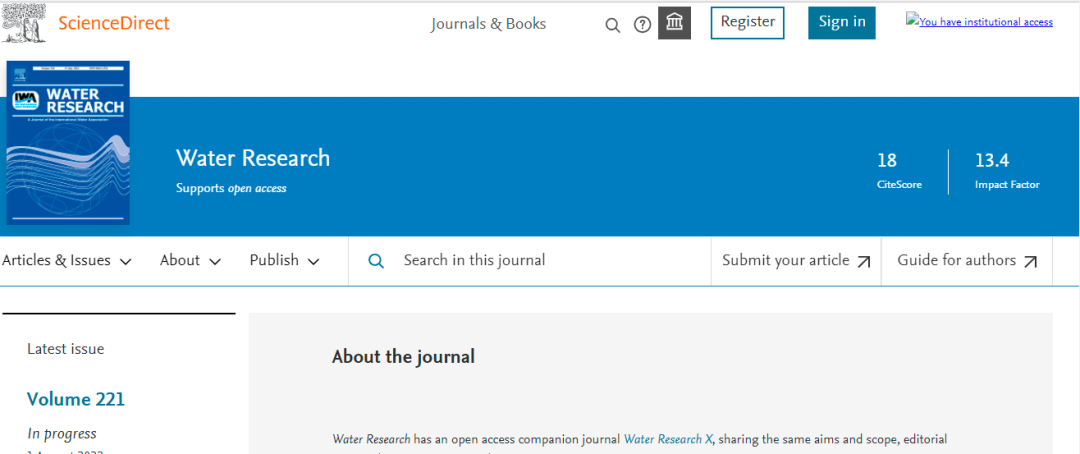今天,我们来看看这本SCI期刊:WATER RESEARCH。从现有的记录来看,WATER RESEARCH 的2022年影响因子(JCR2021)是13.400,2021年影响因子11.236,2020年影响因子9.130。