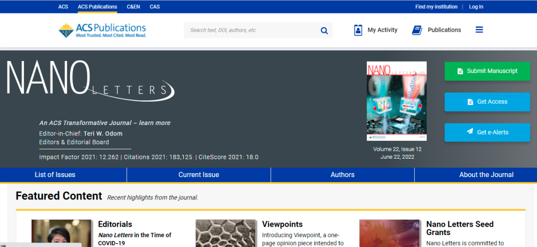 今天,我们来看看这本SCI期刊:NANO LETTERS。从现有的记录来看,NANO LETTERS 的2022年影响因子(JCR2021)是12.262,2021年影响因子11.189,2020年影响因子11.238。