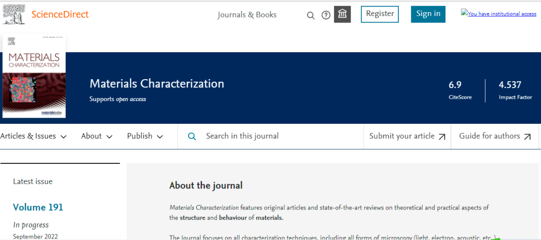 今天,我们来看看这本SCI期刊:MATERIALS CHARACTERIZATION。从现有的记录来看,MATERIALS CHARACTERIZATIONt 的2022年影响因子(JCR2021)是4.537,2021年影响因子4.342,2020年影响因子3.562。