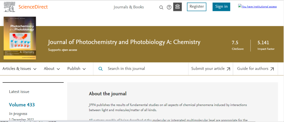 今天,我们来看看这本SCI期刊:JOURNAL OF PHOTOCHEMISTRY AND PHOTOBIOLOGY A-CHEMISTRY。从现有的记录来看,JOURNAL OF PHOTOCHEMISTRY AND PHOTOBIOLOGY A-CHEMISTRY 的2022年影响因子(JCR2021)是5.141,2021年影响因子4.291,2020年影响因子3.306。