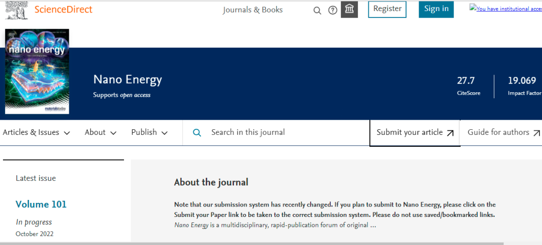 今天,我们来看看这本SCI期刊:Nano Energy。从现有的记录来看,Nano Energy 的2022年影响因子(JCR2021)是19.069,2021年影响因子17.881,2020年影响因子16.602。
