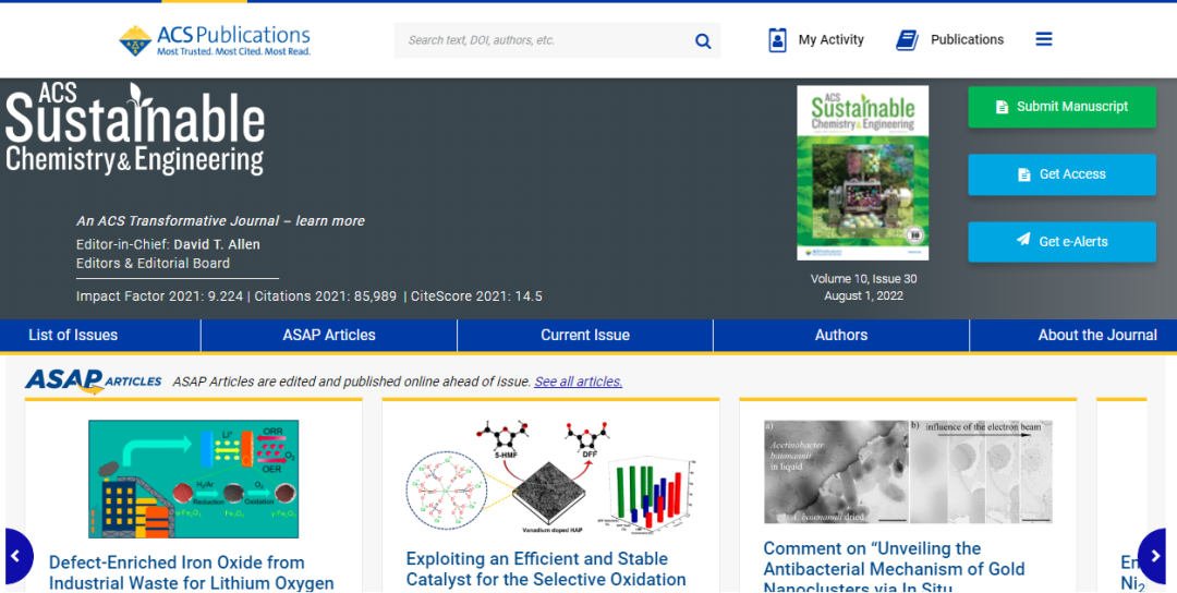 今天,我们来看看这本SCI期刊:ACS Sustainable Chemistry & Engineering。从现有的记录来看,ACS Sustainable Chemistry & Engineering的2022年影响因子(JCR2021)是9.224,2021年影响因子8.198,2020年影响因子7.632。