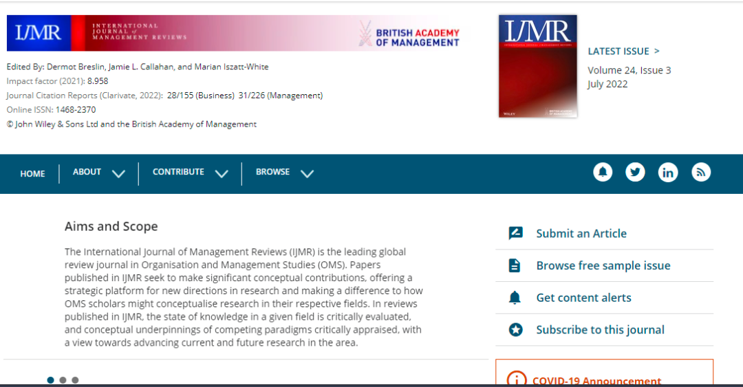 今天,我们来看看这本SCI期刊:INTERNATIONAL JOURNAL OF MANAGEMENT REVIEWS。从现有的记录来看,INTERNATIONAL JOURNAL OF MANAGEMENT REVIEWS 的2022年影响因子(JCR2021)是8.958,2021年影响因子13.419,2020年影响因子8.631。