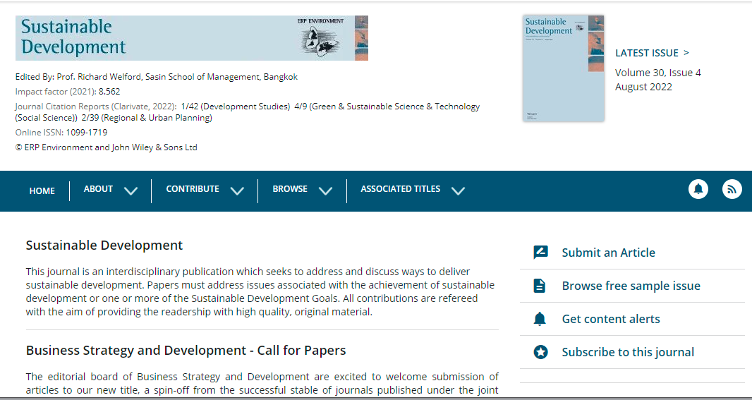 今天,我们来看看这本SCI期刊:SUSTAINABLE DEVELOPMENT。从现有的记录来看,SUSTAINABLE DEVELOPMENT 的2022年影响因子(JCR2021)是8.562,2021年影响因子6.159,2020年影响因子4.082。
